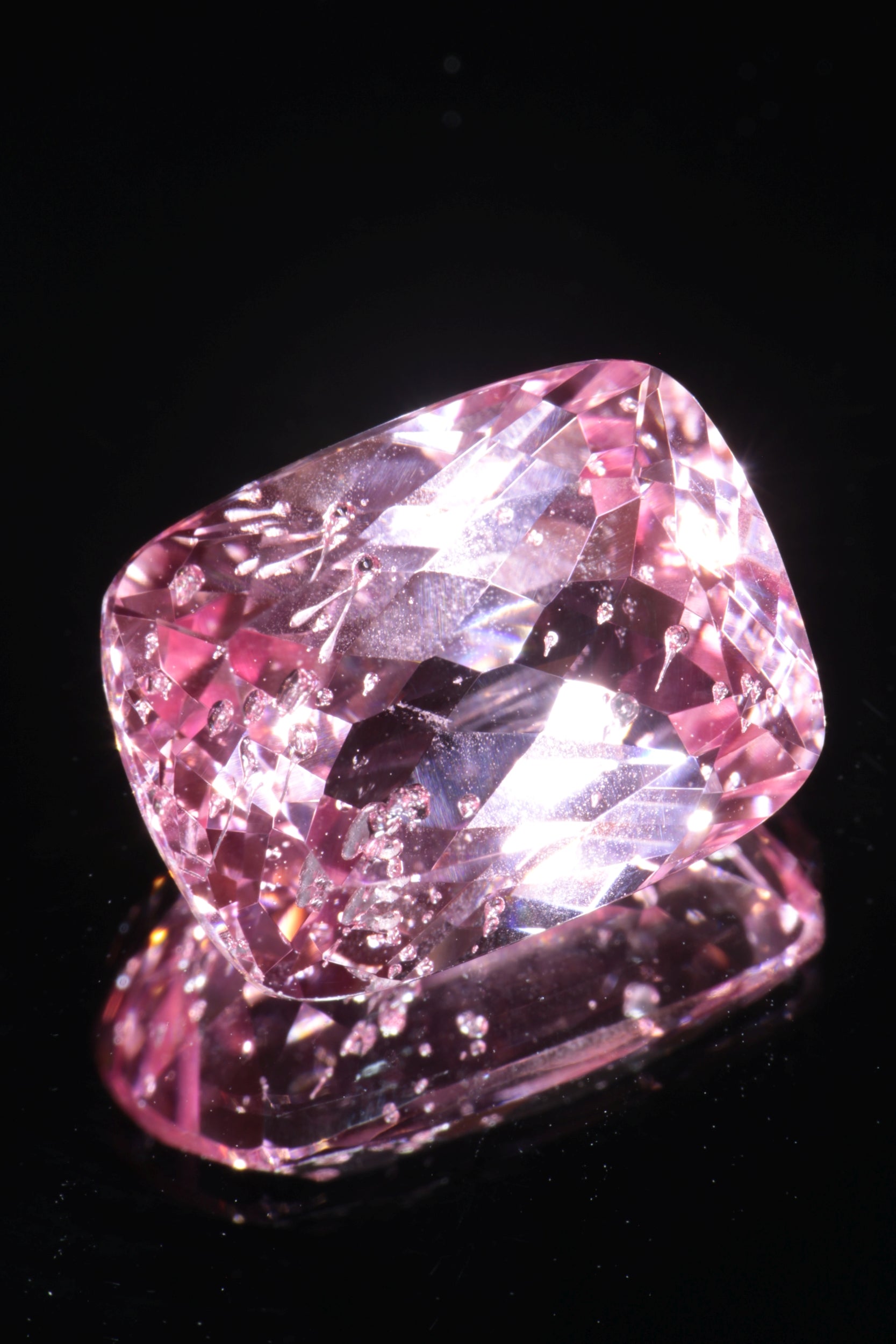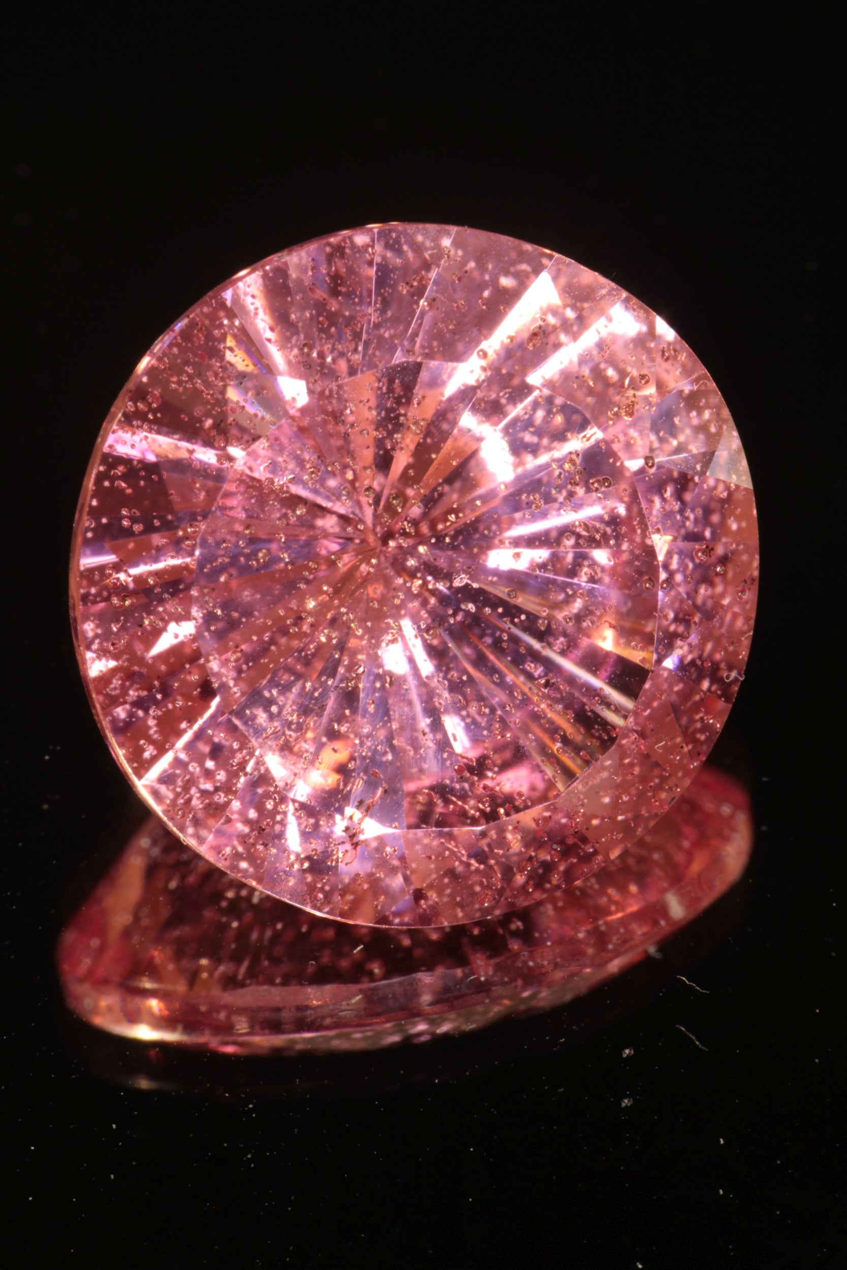 These are fantasy cut pink laser sapphires, most with concave facets. These labgrown sapphires have bubbles in them from the growth process -- we call this variety 'strawberry sapphires' since they have seeds.