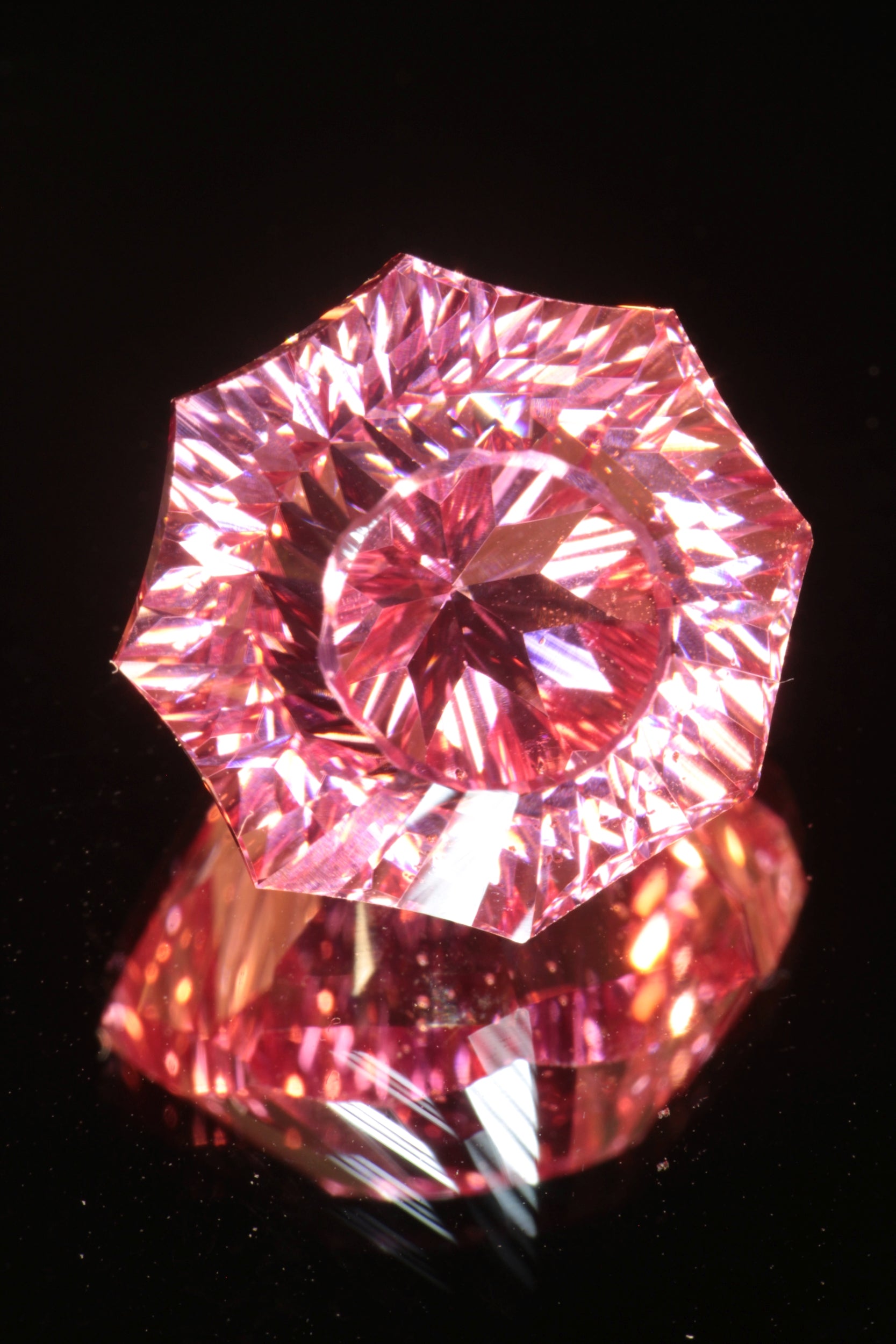 When it's grown with industrial purity, however, however, the resulting crystal is a bright padparascha-like pink color which shifts between a starburst pink and a more pink-orange depending on the lighting. We were able to get some leftover offcuts from a laser crystal grower--these were not produced for the gem trade but they make for incredible gems.