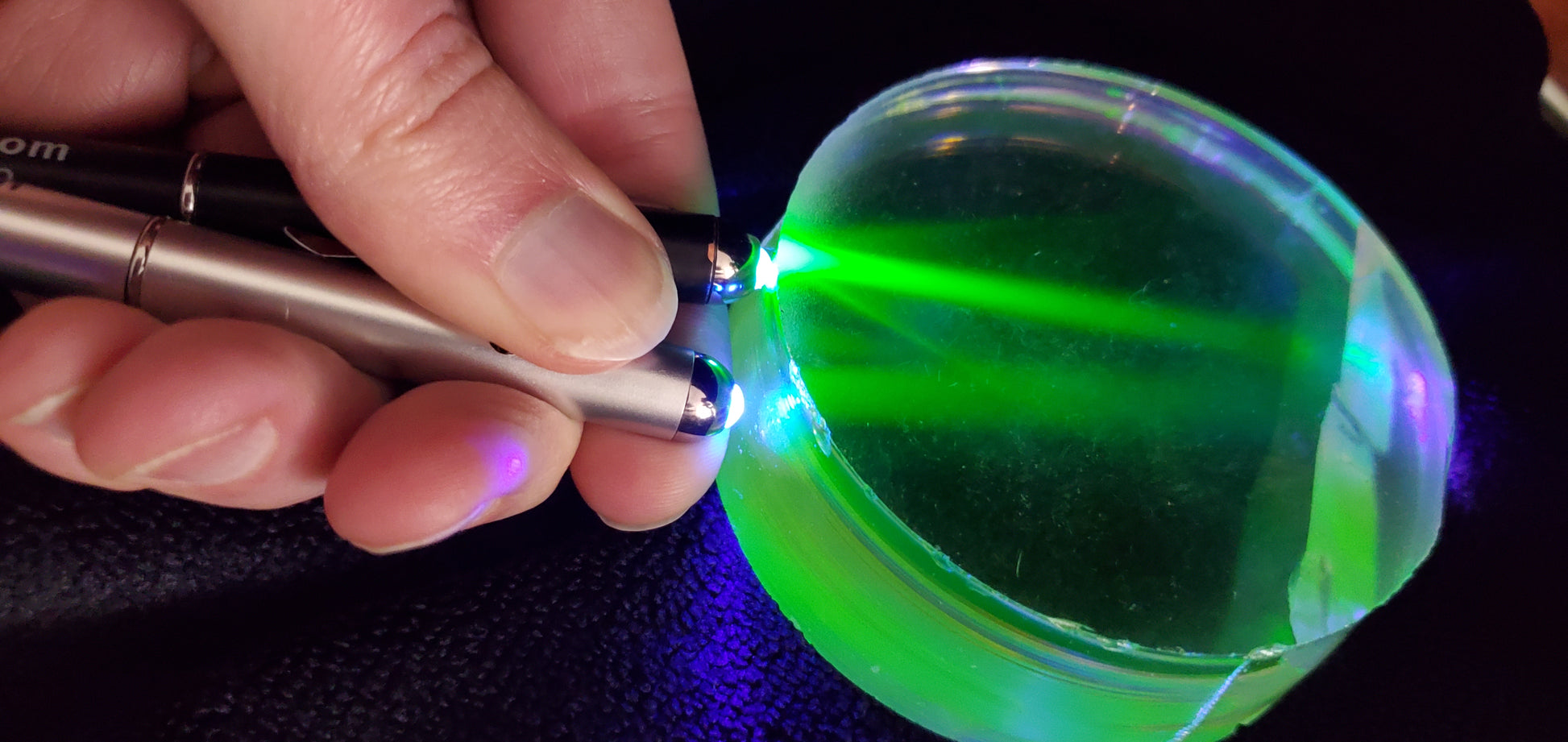 This is erbium-doped lithium niobate, a rare laser crystal which has been used in new breakthrough on-chip lasers. The erbium allows it to act as a far infrared laser crystal but also gives it a gorgeous pink-to-orange color changing base color as well as strong green fluorescence. Cut stones may have a green cast in direct lighting, and should otherwise resemble a pink diamond(!)