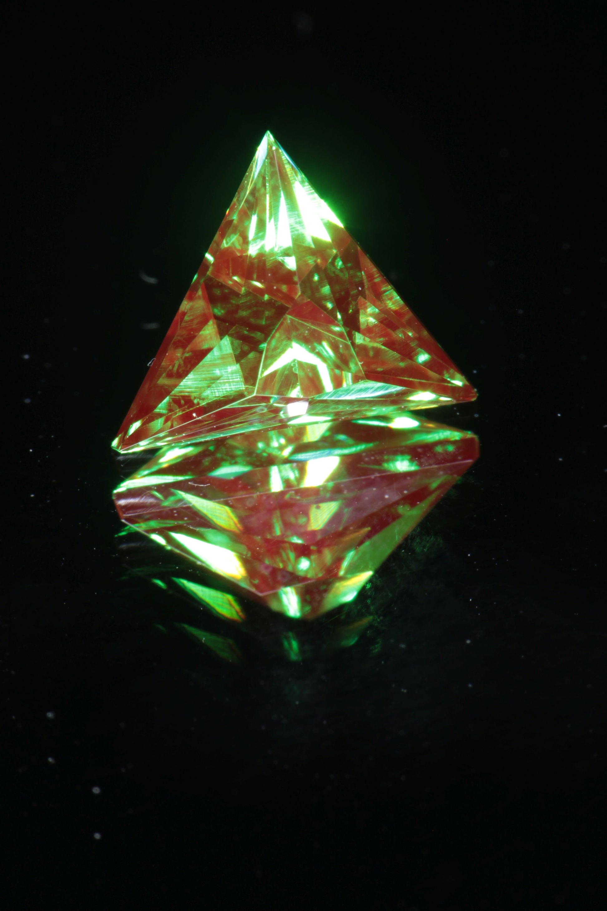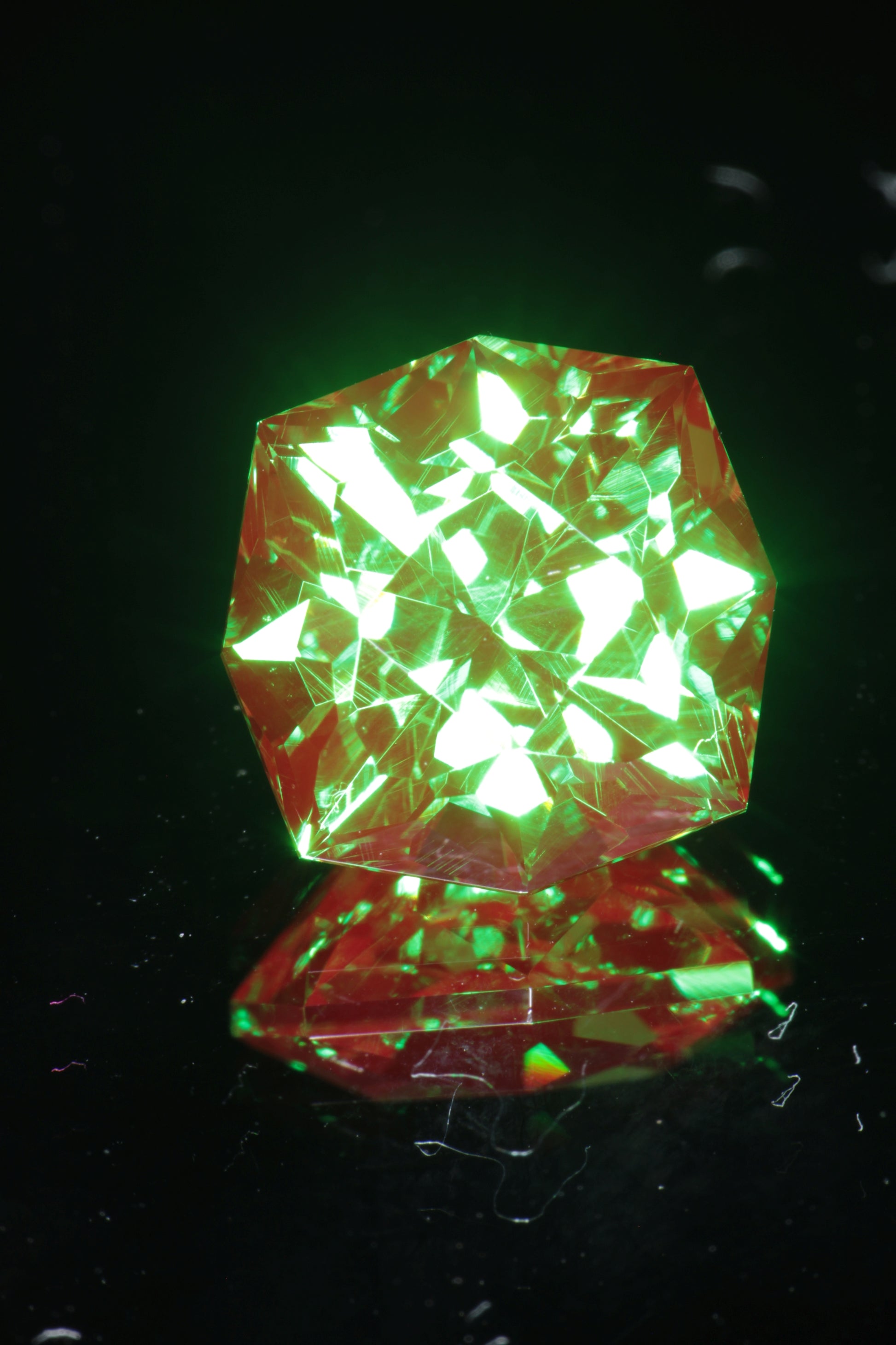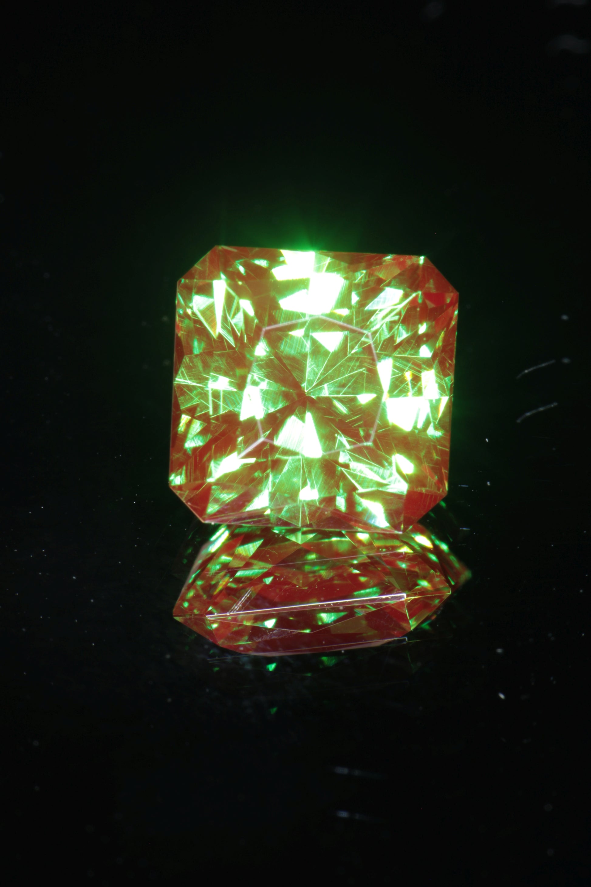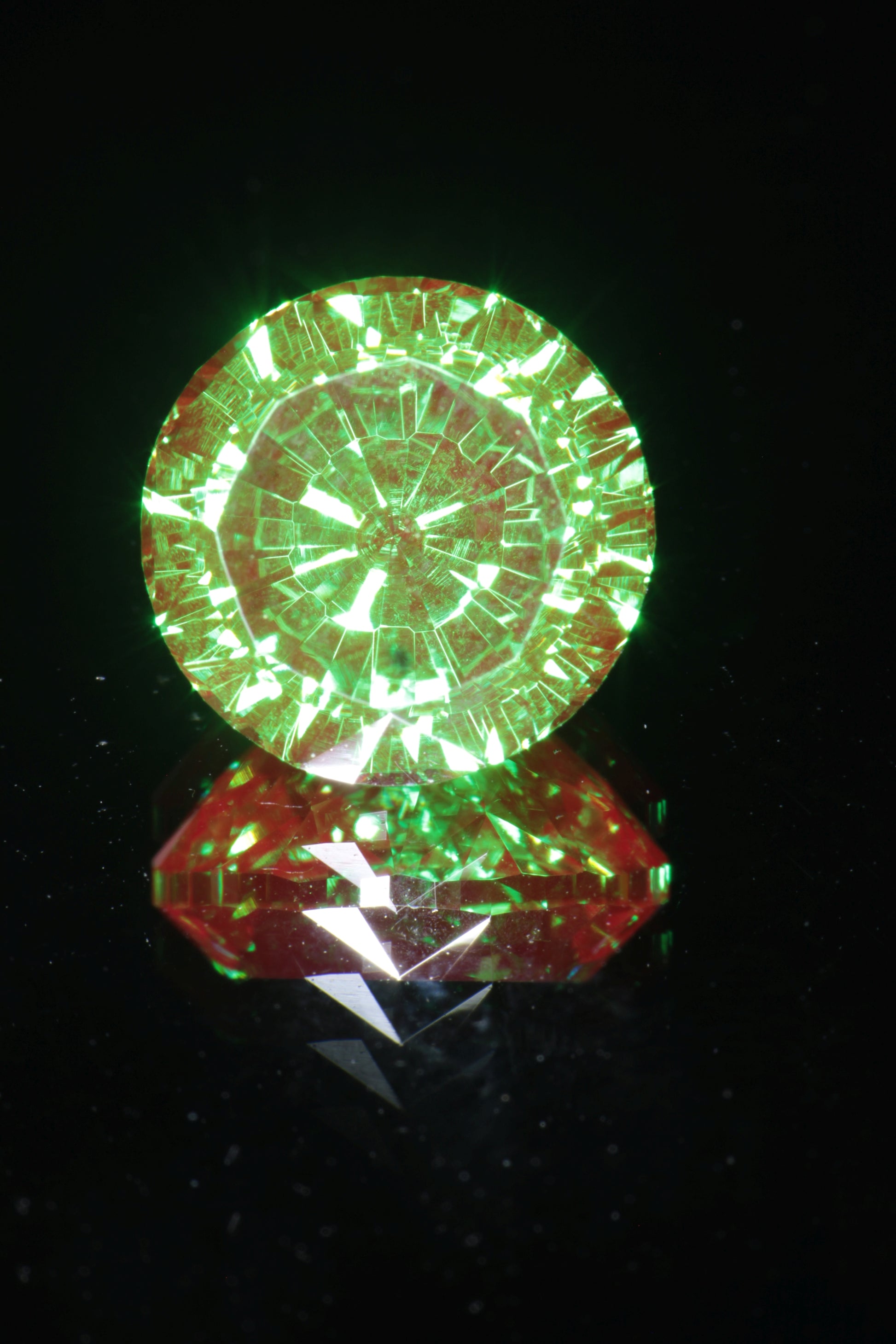 From a gem perspective it is also amazing material. It looks similar to our classic christmas garnet, with a rich green base and strong red fluorescence, but with an even richer and slightly bluer green base. It also has odd pale yellow fluorescence under short wave unlike classic christmas garnet which is red in short and long wave, so it is easy to distinguish from the more common chromium YAG. We have a limited amount of this material and it's one of the best things we've ever gotten.