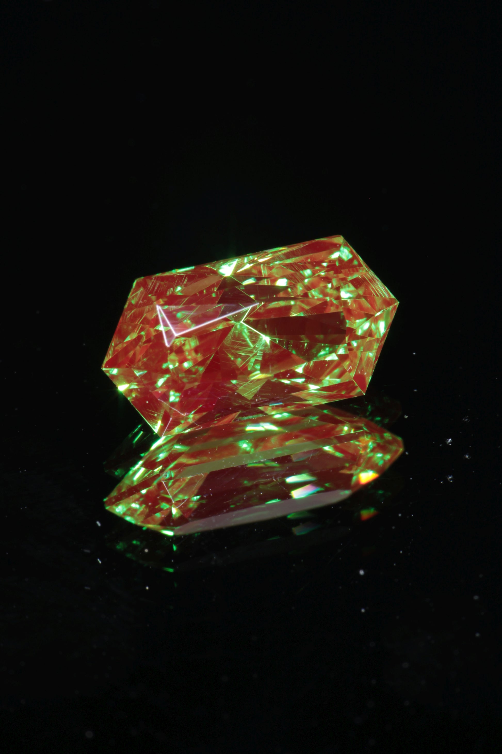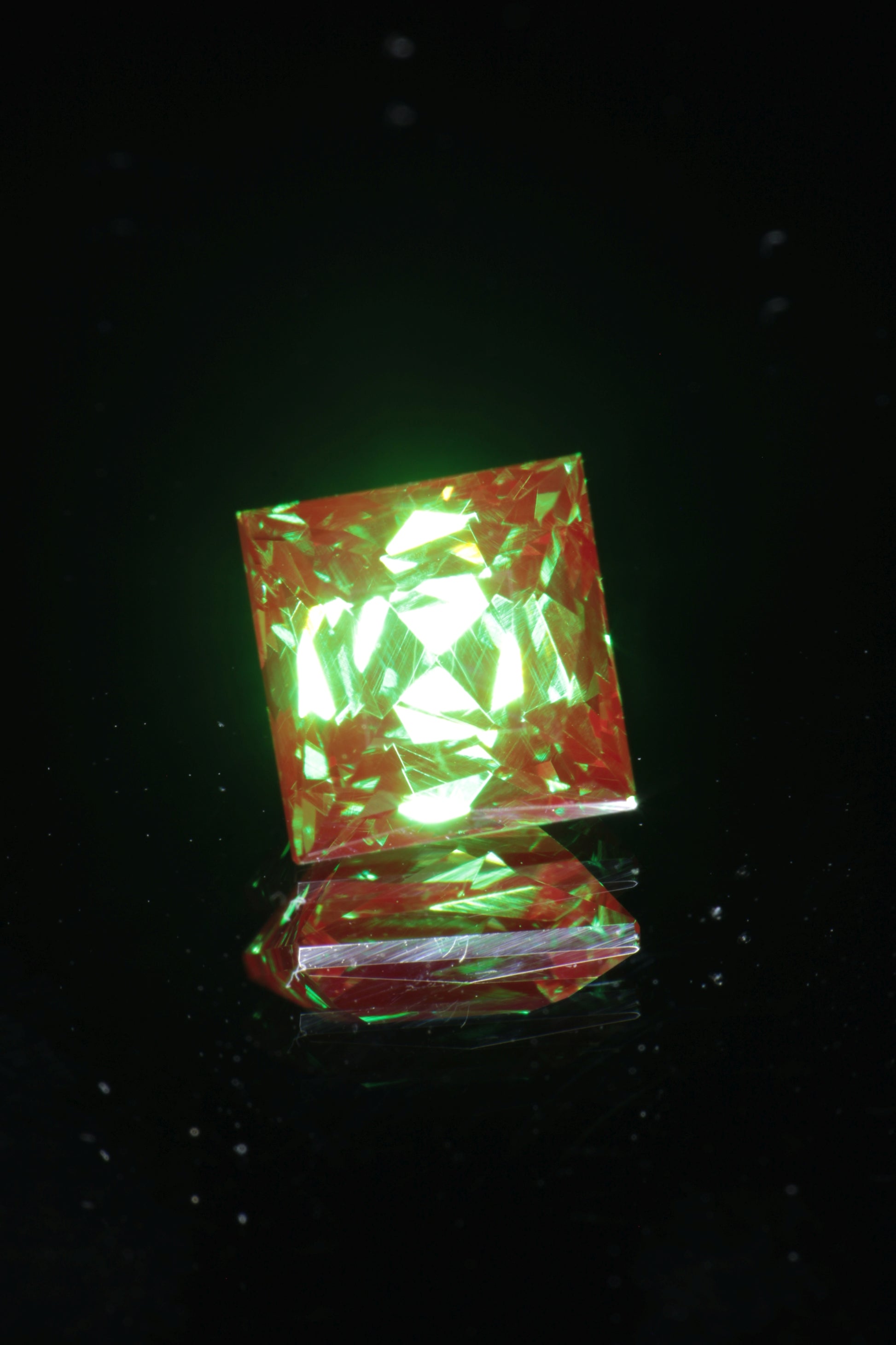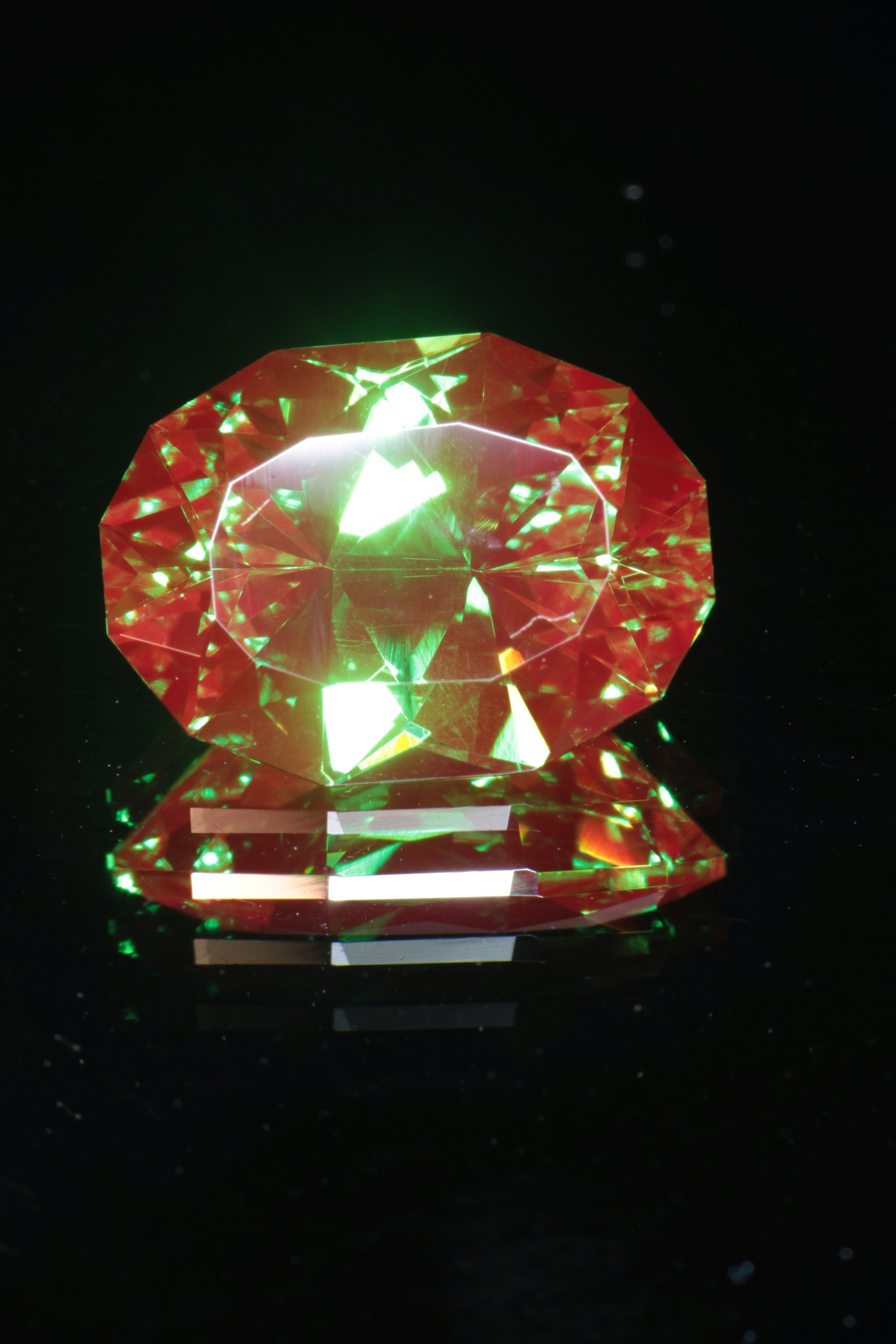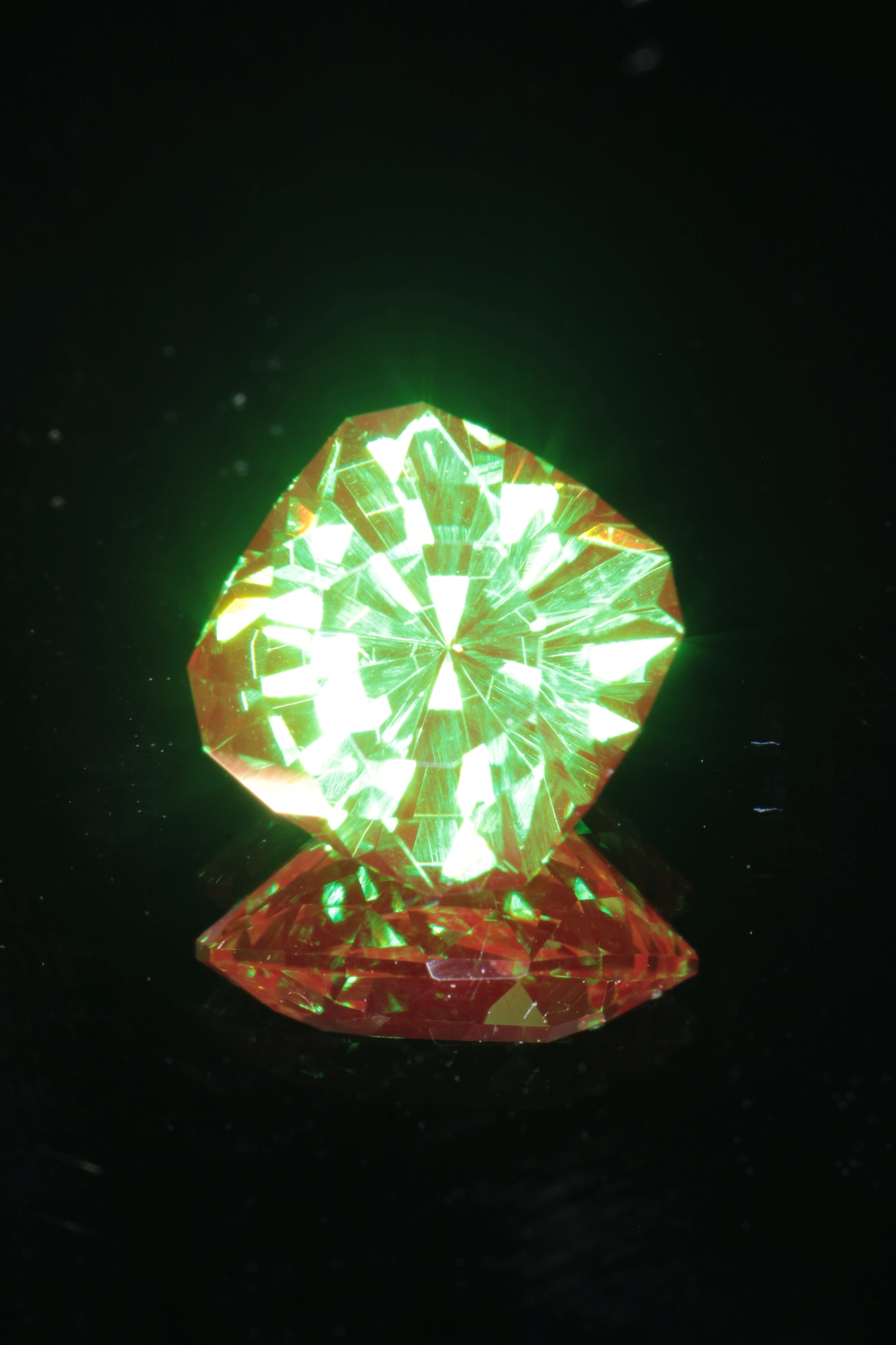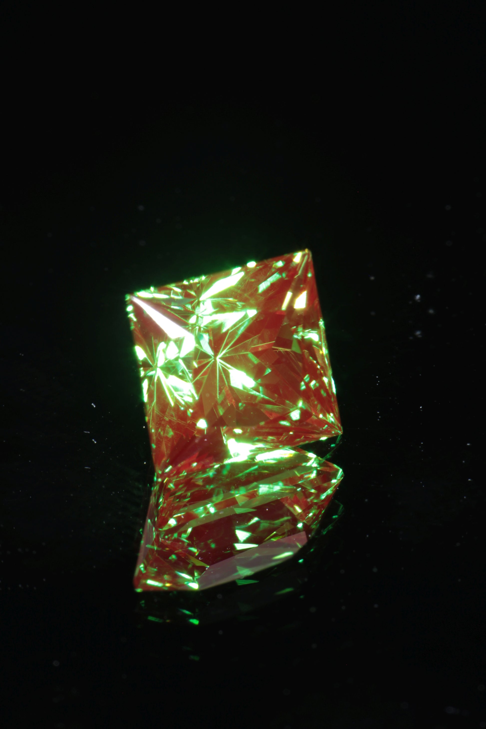 From a gem perspective it is also amazing material. It looks similar to our classic christmas garnet, with a rich green base and strong red fluorescence, but with an even richer and slightly bluer green base. It also has odd pale yellow fluorescence under short wave unlike classic christmas garnet which is red in short and long wave, so it is easy to distinguish from the more common chromium YAG. We have a limited amount of this material and it's one of the best things we've ever gotten.